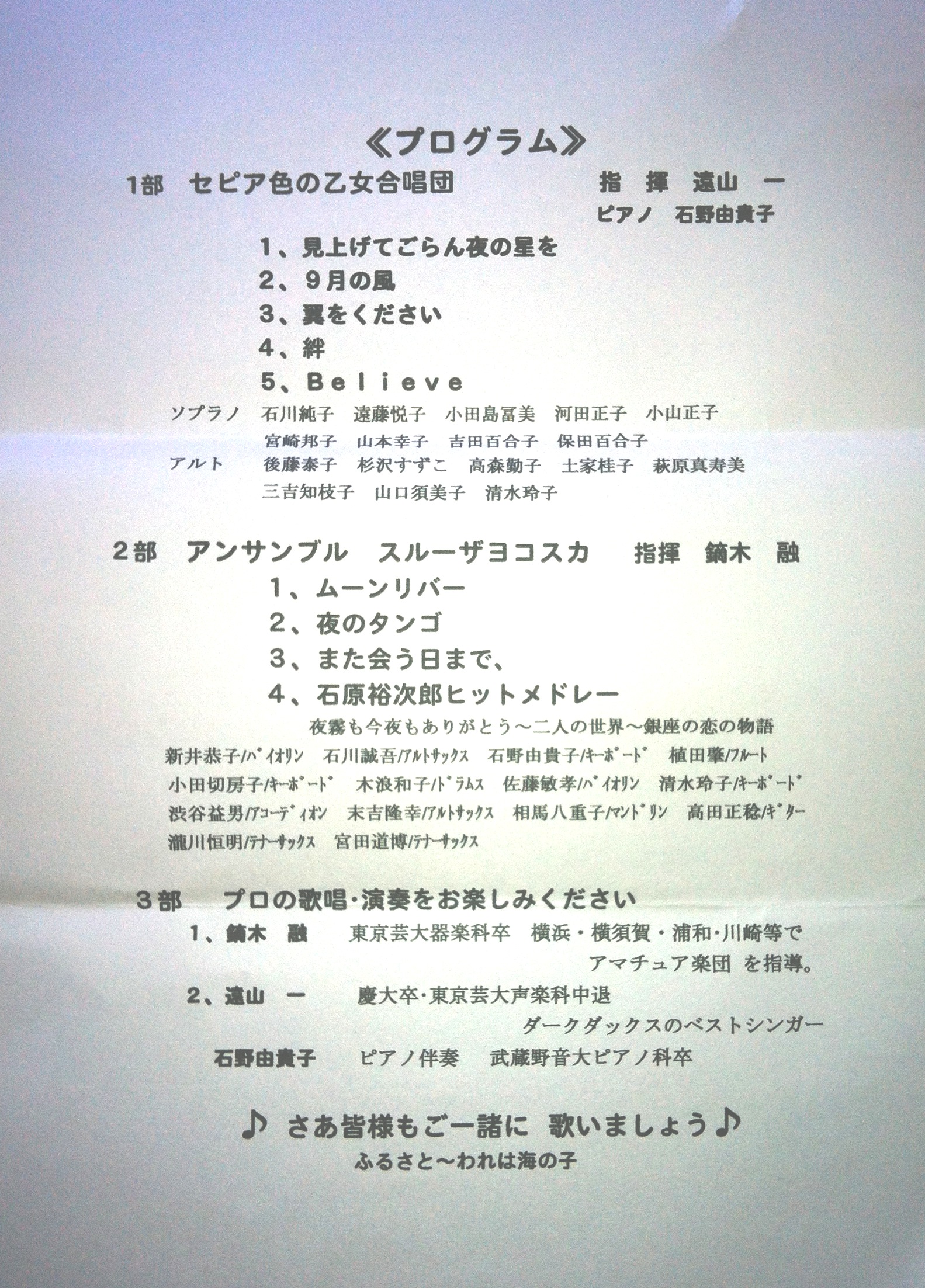 一部は「セピア色の乙女合唱団」16人のコーラス、指揮は遠山一氏、ユーモアたっぷりでコーラスより彼の進行や話し上手が見事でした。