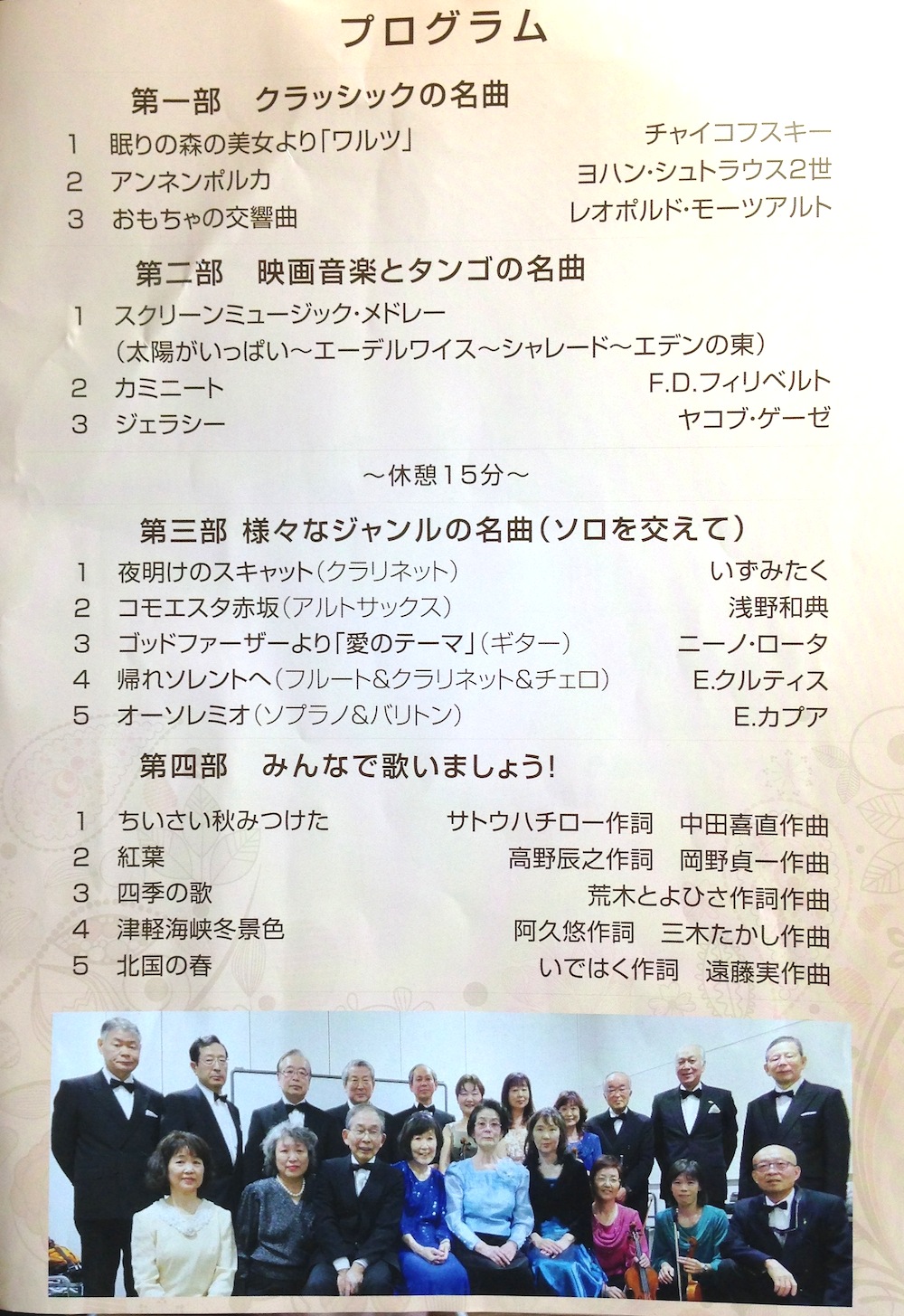 私共は上手下手ではなく、共通の趣味である音楽の演奏を生きがいとして、アットホームな雰囲気で共に楽しみ、更に、聴いていただける方々に少しでも心の安らぎを得て頂けるよう努力して参りたいと決意を新たにしております。