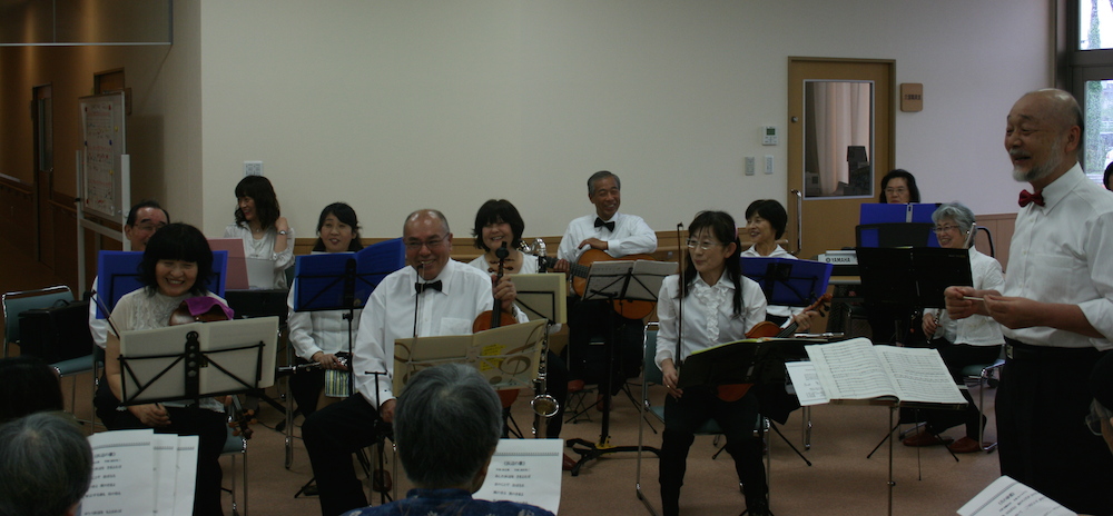 オープニングに、利用者の方やスタッフの皆様が私達と一緒に、「夕やけ小焼け」をカスタネットや鈴・ハンドベルで演奏を致しまして、そのあとに「遠くへ行きたい」「月の砂漠」「浜辺の歌」「知床旅情」中に楽器の紹介を入れさせて頂き、「瀬戸の花嫁」「川は呼んでいる」「恋は水色」「影を慕えて」の9曲を演奏させて頂きました。