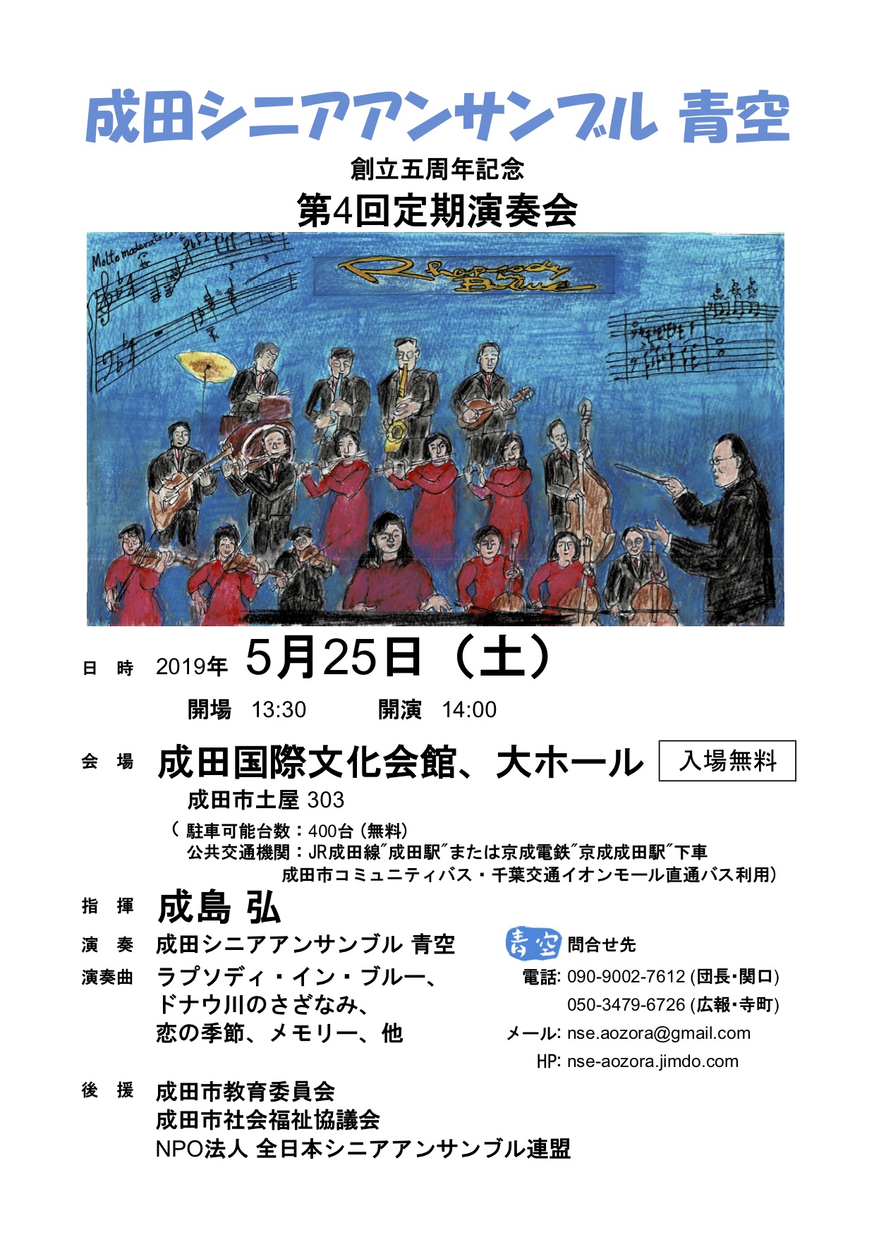 平成25年9月に創立した「青空」は昨年9月に満5年を迎え、5周年記念と銘打った第4回定期演奏会を令和1年5月25日に行いました。