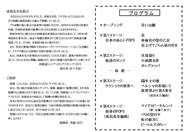 当団を設立以来12年にわたって御指導いただいた、成島 弘先生を偲ぶ「追悼演奏会」を開催しました。 当日は先生とかかわりのある方々を含め300名あまりのお客様に来ていただき、昨年1月のニューイヤーコンサート以来の音楽に触れる一時を過ごしていただきました。 演奏に先立ち四街道市長、教育長の挨拶をいただき、青い山脈のオープニングで開演です。 曲目は下記のプログラムのとおりです。 なお後半の開始前には、故成島先生のご長男から挨拶をいただき、先生のプライベートも含めた人となりの一端をご紹介いただきました。 プログラムに沿って演奏を進め、全曲終了後、大きな拍手とアンコールの声に答えて愛の讃歌とテネシーワルツを演奏して、無事に終了しました。 帰りに受付で挨拶をしていたところ、当団員からの紹介で初めてきましたという老婦人から「とても素晴らしい演奏に感激しました。団員の皆様も健康に気を付けてください。また聴きに来ます」と励まされました。また、ブログ子のテニス仲間からは「本格的な演奏に驚いた。とくに管楽器のきれいな音が印象に残った」との感想をいただきました。 当団は設立13年目に入り、次回の第17回定期演奏会を今年10月9日に予定しています。 団員一同、また新たな曲に挑戦しながら、できるだけ長く演奏活動を続けたいと思っています。 皆様の暖かいご支援をよろしくお願い申し上げます。なお、演奏に興味のある方は是非気軽にご連絡ください。