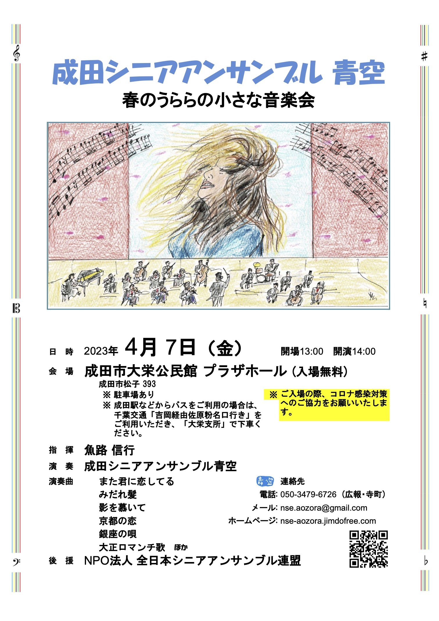 4月7日、悪天の予報が出されていた中、成田シニアアンサンブル青空は「春のうららの小さな音楽会」と銘打ったコンサートを開催いたしました。