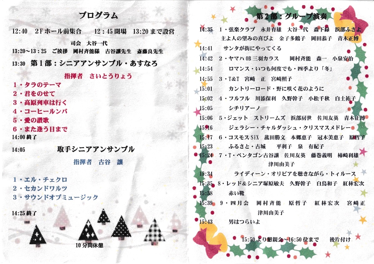 こんな状態を打開するために去る12月17日(日)午後、取手市藤代公民館のホールにて標記の演奏会が催された。演奏は最初に各団が30分間ずつ演奏(リハーサルを含む)があり、続いて9グループのグループアンサンブル